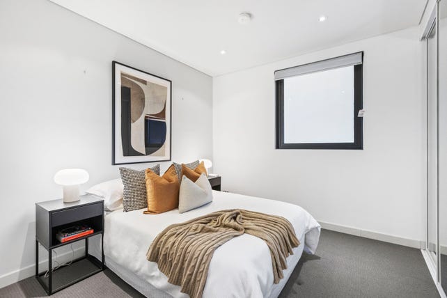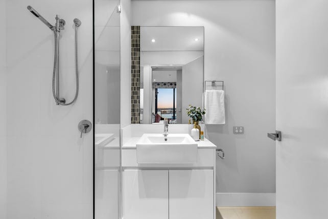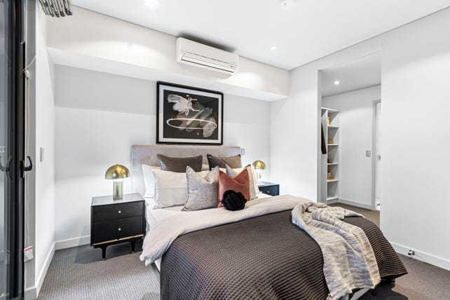 Apartment extras include carpeted bedrooms, full-height windows and balcony sliders, an audio-intercom security system, split-system air-conditioning, modern blind fittings, shadow-line ceiling cornices, feature skirting boards, down lights and an internal electric hot-water system, within the laundry nook.