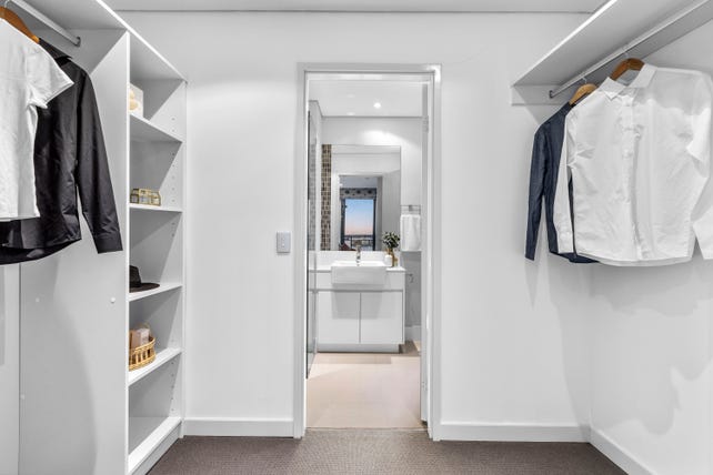 Back inside, the carpeted master-bedroom suite also enjoys both balcony access and a spectacular water outlook, as well as boasting a fitted “his and hers” walk-in wardrobe that precedes a private ensuite bathroom – shower, stone vanity, under-bench storage, toilet and all.