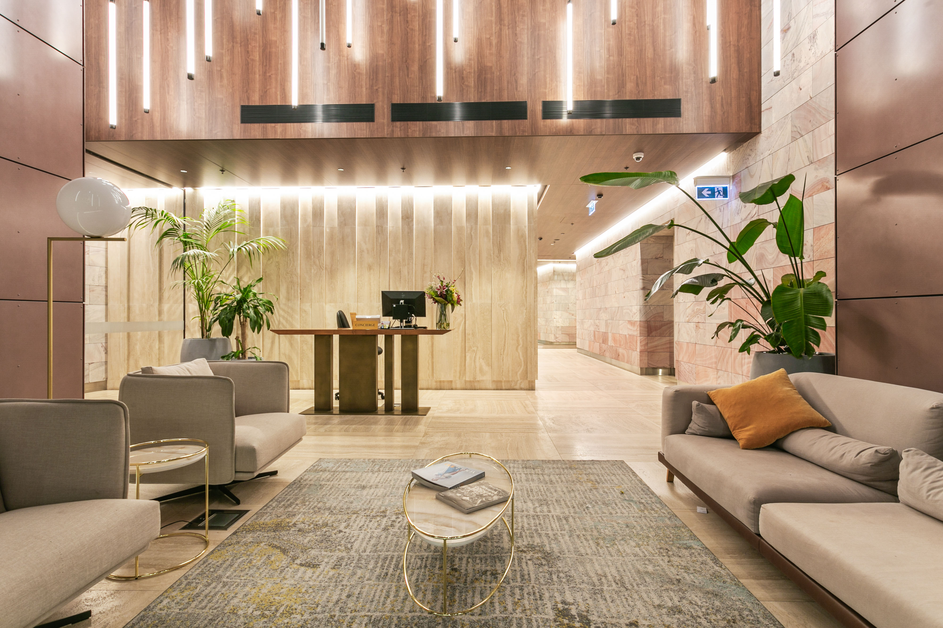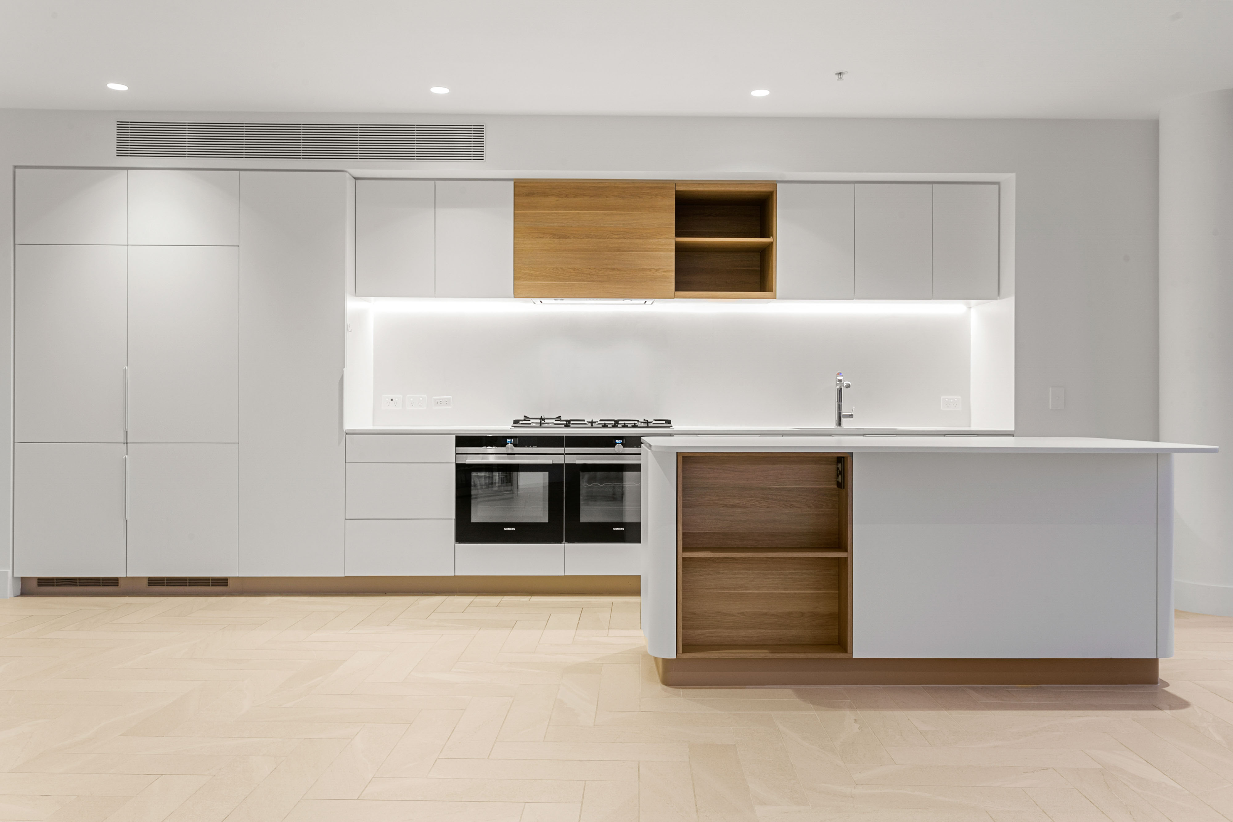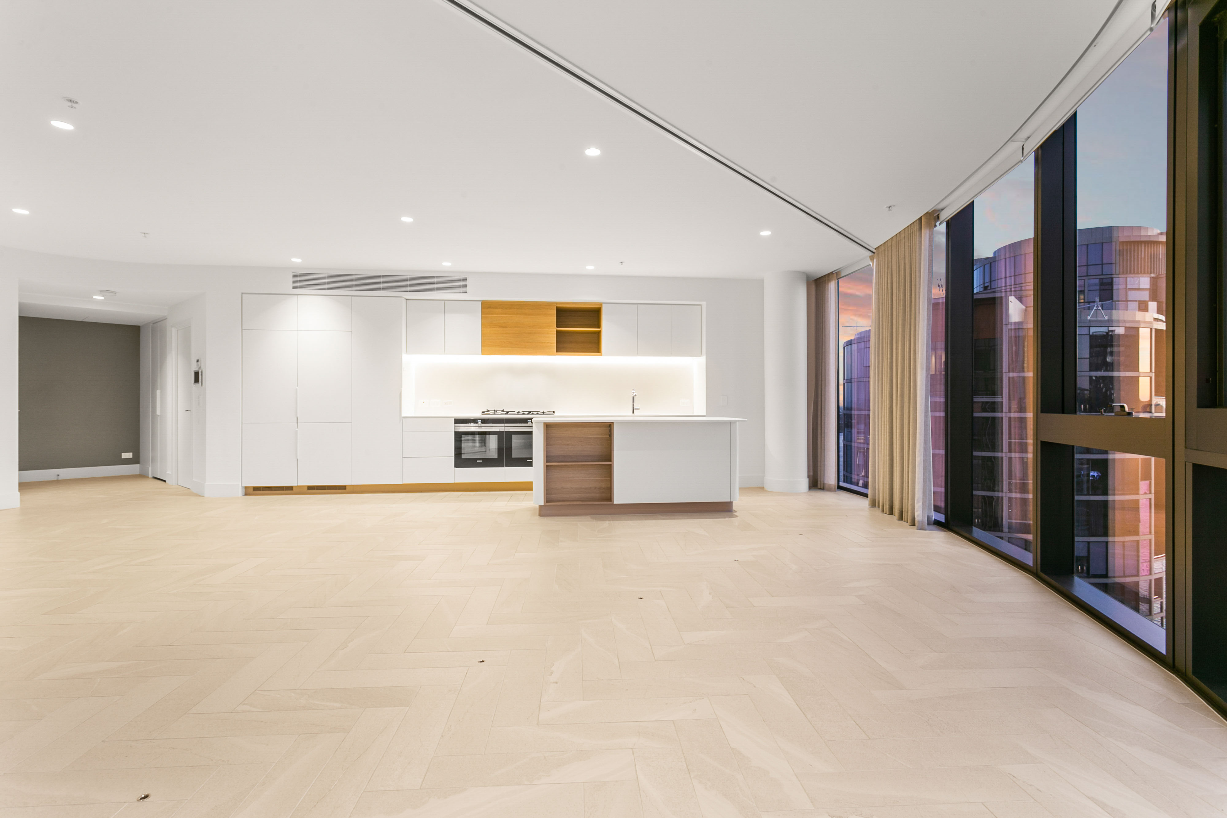 The living spaces are adorned with parquetry marble-like flooring and gold wallpaper, creating a sense of opulence and style. The open-plan kitchen, lounge, and dining area are perfect for both relaxing and entertaining. The kitchen is a chef's dream, equipped with stone benchtops, undermount sinks, gas cooking, and fully integrated appliances including a fridge, freezer, dishwasher, microwave, and oven.