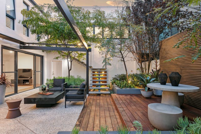 Step outside into the Zen-inspired, fully landscaped gardens, designed for intimate gatherings and special moments with family and friends. A patio with a remote retractable awning provides a shady spot for alfresco dining whilst allowing you to regulate the amount of natural light inside too. A raised timber deck set against a timber backdrop provides an enchanting spot to sit amongst the lush greenery. And a custom-crafted steel staircase connects the backyard to the upstairs primary suite in perfect harmony.