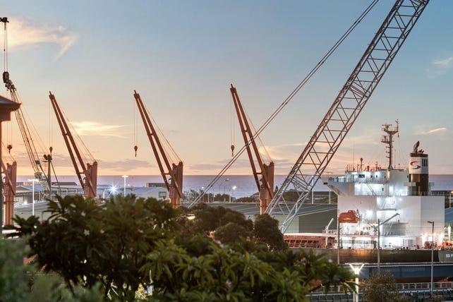 This home sits among other high-quality residences in an enviable position with the iconic rainbow sea container, the river and Fremantle Port visible at the end of