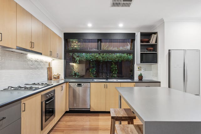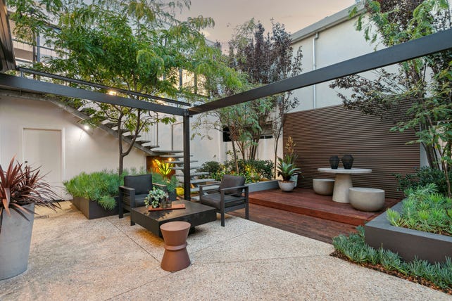 Unassuming from the street, a private landscaped sanctuary unfolds beyond the secure front gate where rich timber decking, textured aggregate, and artful metalwork harmonize with layered plantings of shrubs and trees, all watered by reticulation with birds flitting amongst the branches overhead.