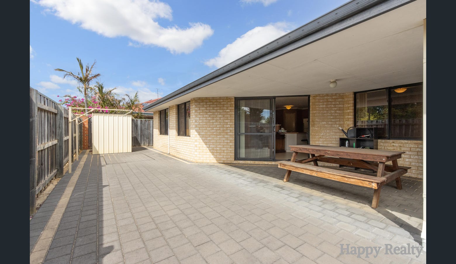 • Low-maintenance backyard with garden shed and water tank