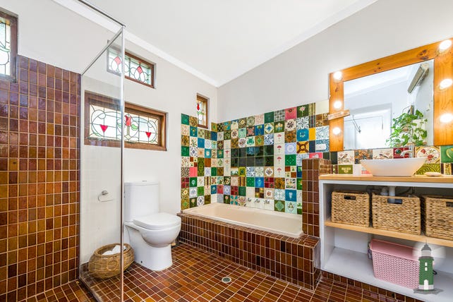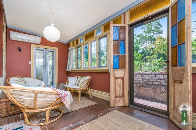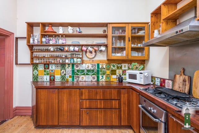 The kitchen and adjacent, open plan air conditioned family room and meals area to the rear of the home enjoys a Northern orientation and is great for entertaining. A door and a servery window allow easy access between the kitchen and the dining and living space, and two sets of timber French doors open out to the magical rear gardens to the North and the undercover patio to the West, which is equipped with a gas bayonet for easy barbecuing. Leadlight windows across the full length of the room create a wonderful, light filled space, where you can bask in the sun on a chilly Winter's day. The kitchen and the large bathroom are both adorned with a beautiful assortment of antique tiles, adding another layer to the historic atmosphere. The bathroom offers a bathtub and separate shower, and sits beside the full sized laundry.