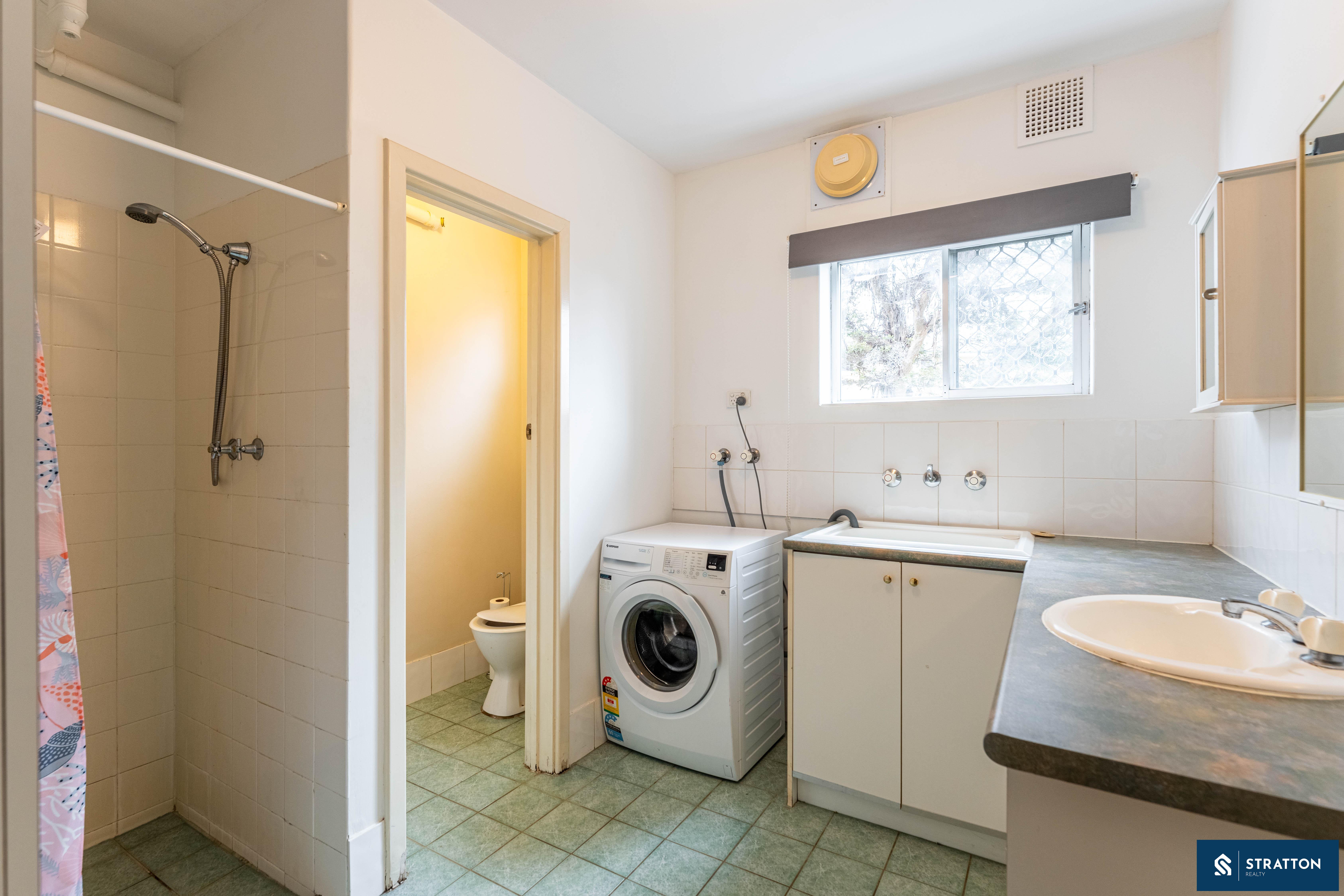 The main bedroom features a built-in robe and a large window overlooking the outdoor area, creating a bright and inviting atmosphere. The second bedroom offers carpet flooring, adding warmth and comfort. The main bathroom includes a built-in linen closet for additional storage, a separate toilet, and a combined laundry area, adding to the unit's convenience.