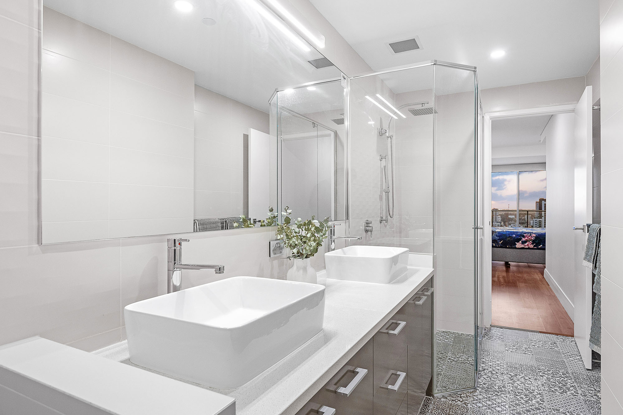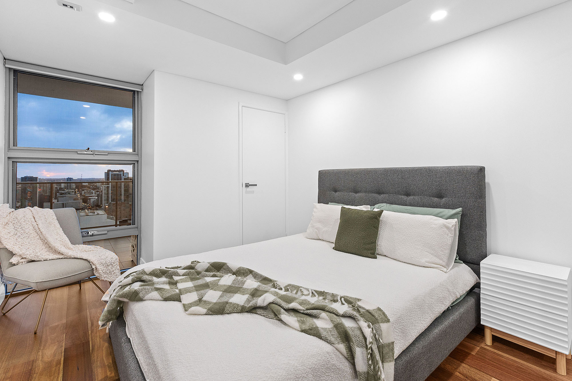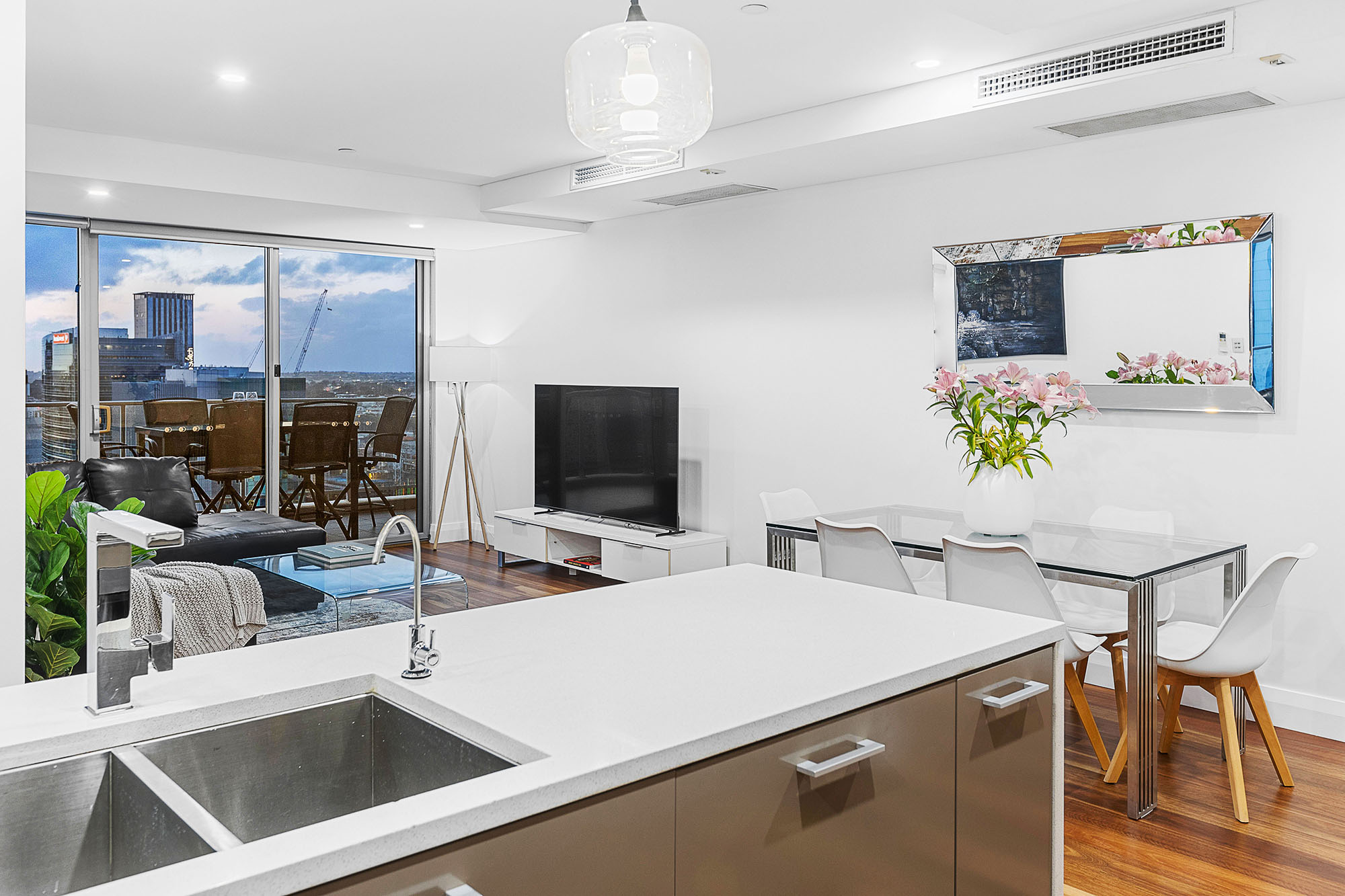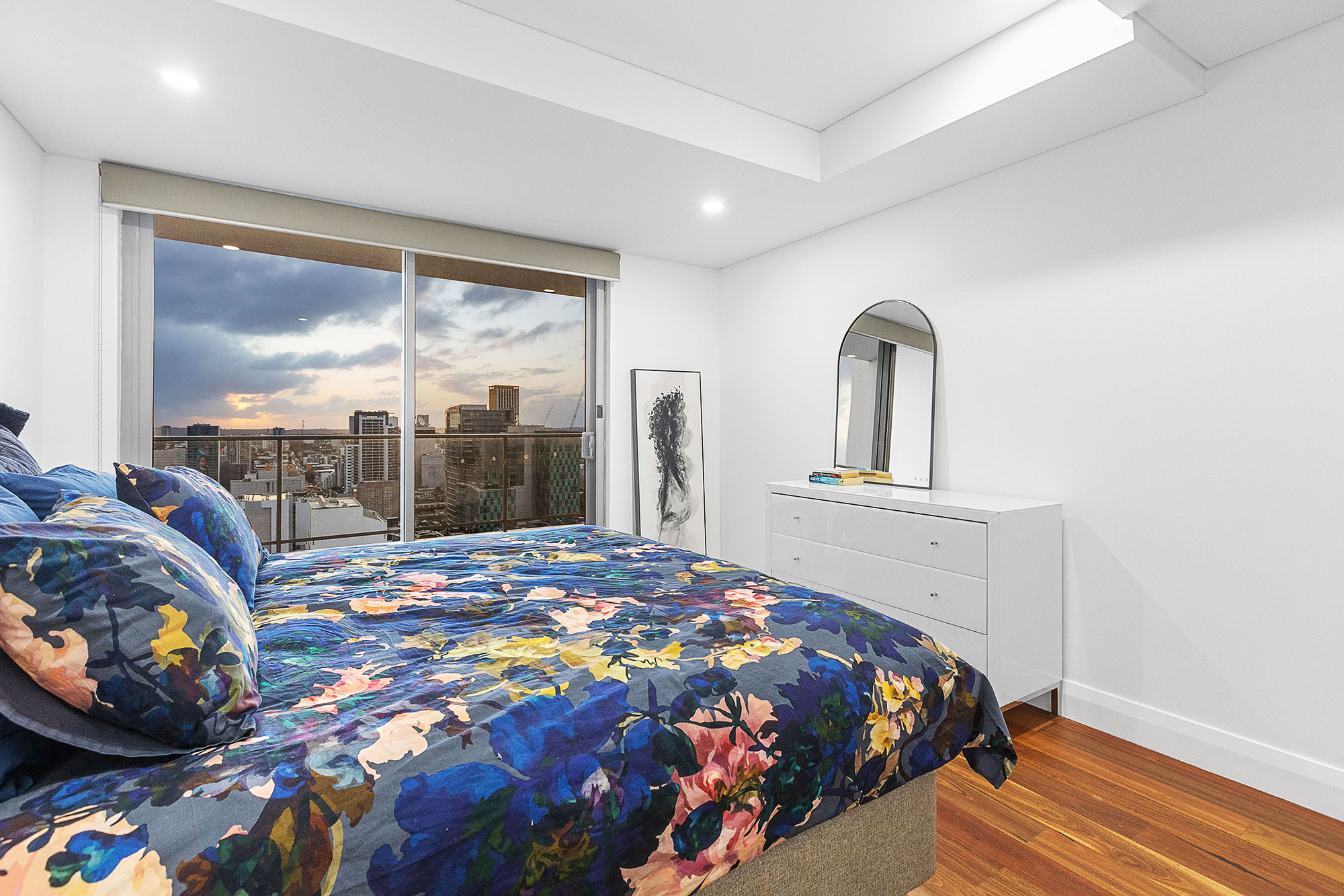Beautifully presented and finished, the apartment boasts 123sqm of total living area showcasing breath-taking views of the city skyline. The master bedroom includes a large walk-through robe and ensuite, featuring stone bench tops and double basins, separate toilet, as well as private balcony access, whilst the second bedroom includes its own built-in mirrored robe.