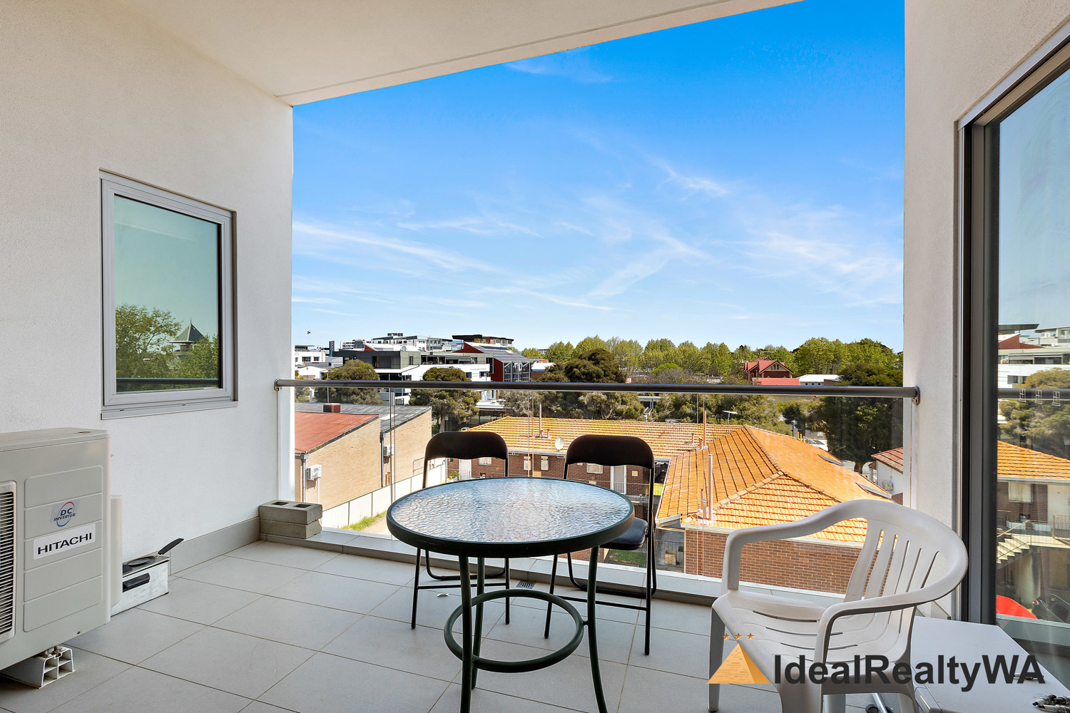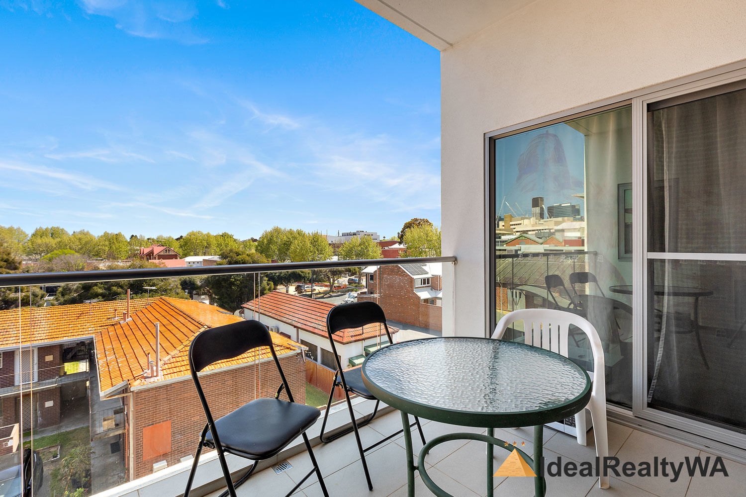 Step outside to the generously-sized, covered balcony—perfect for entertaining—complete with a manual roller blind for added privacy and weather protection. Enjoy views of tree-lined Weld Square Park, HBF Park’s light towers, Perth’s rolling hills, and even glimpses of the city skyline.