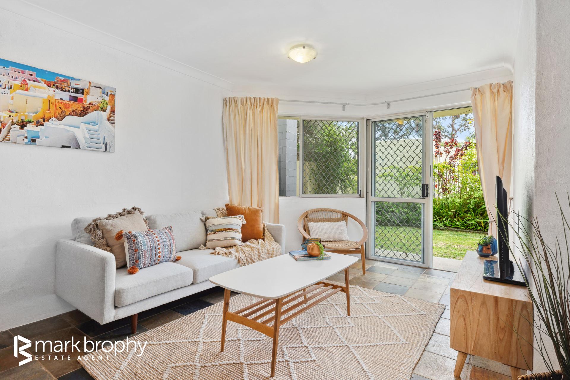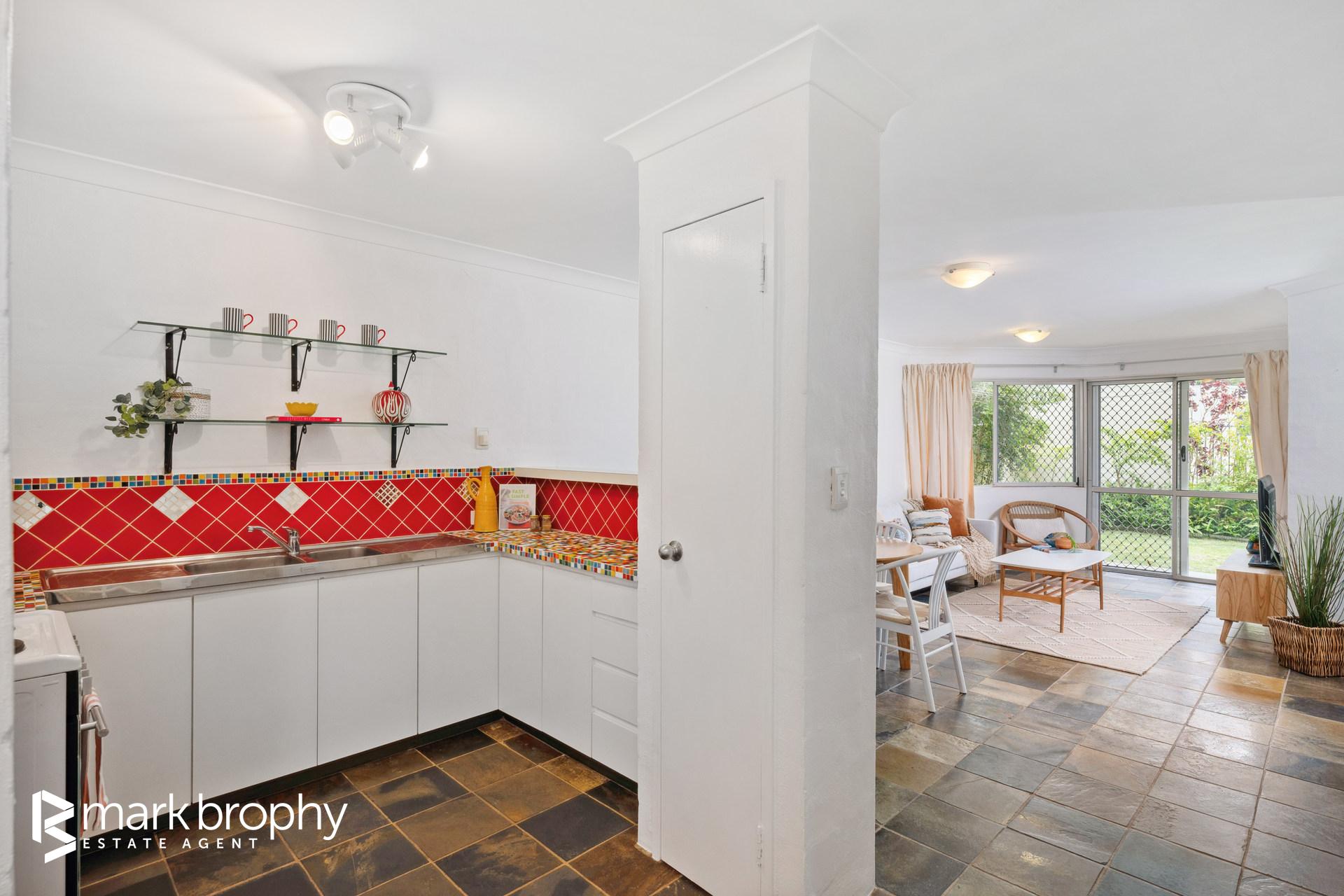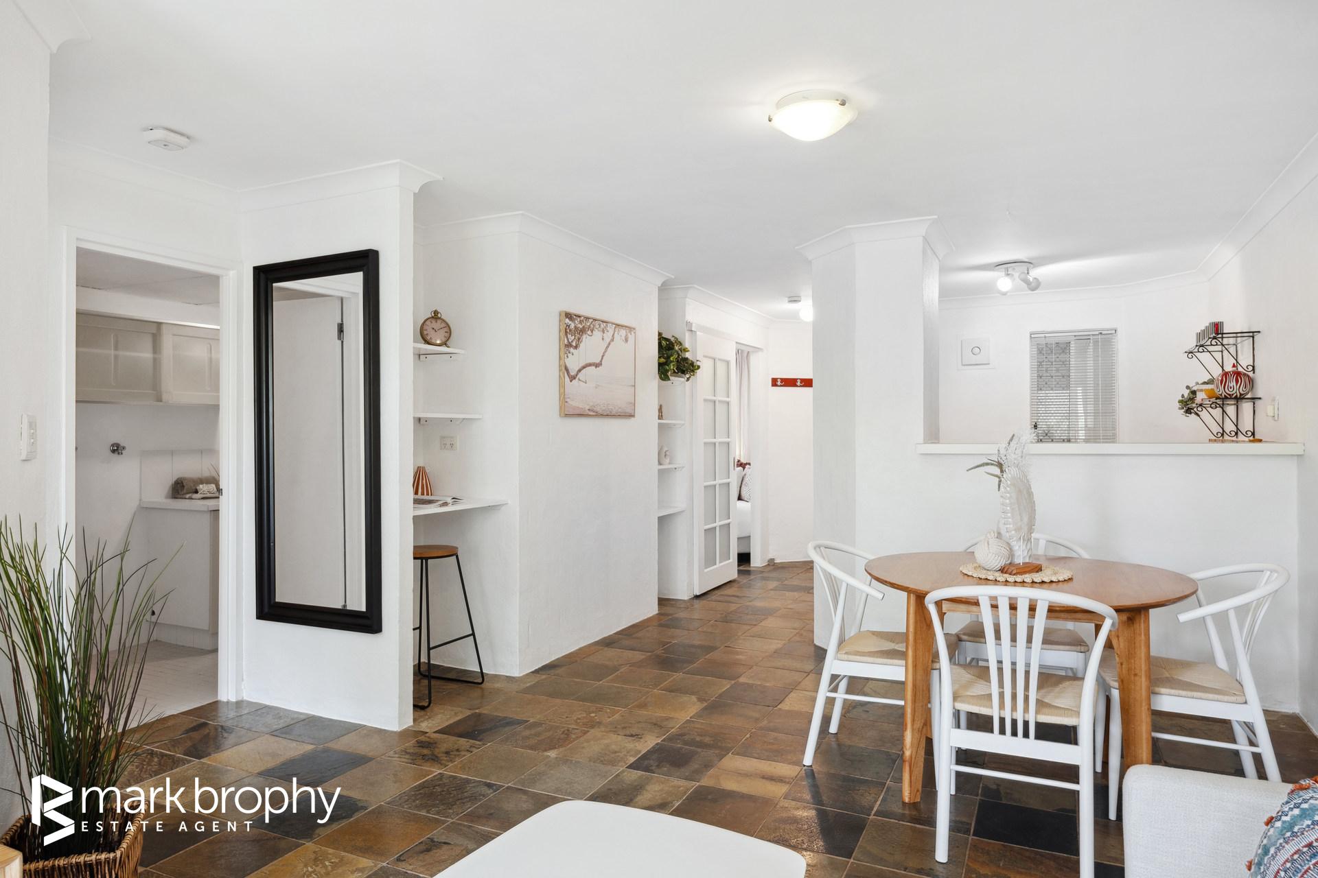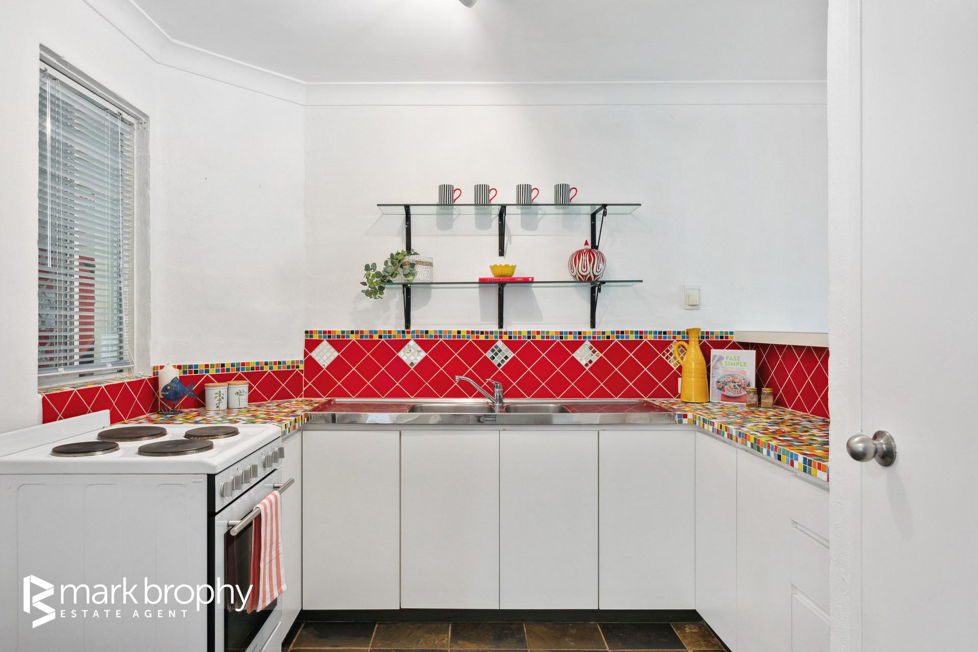 • Good sized colourful kitchen adjacent the dining area • Two bedrooms with built in robes • Leafy green grounds reminiscent of a resort • Ground floor - no stairs • Designated parking for 1 (Council of Owners ratified) • 2 km to Fremantle C.B.D. • Below ground pool