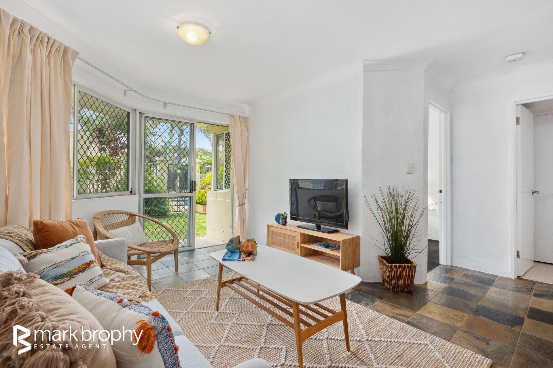 A fresh 2 bedroom ground floor apartment with a lovely northern aspect and outlook to the pool. Both bedrooms have built in robes and the white and light bathroom has a combined laundry and is conveniently placed between the two.