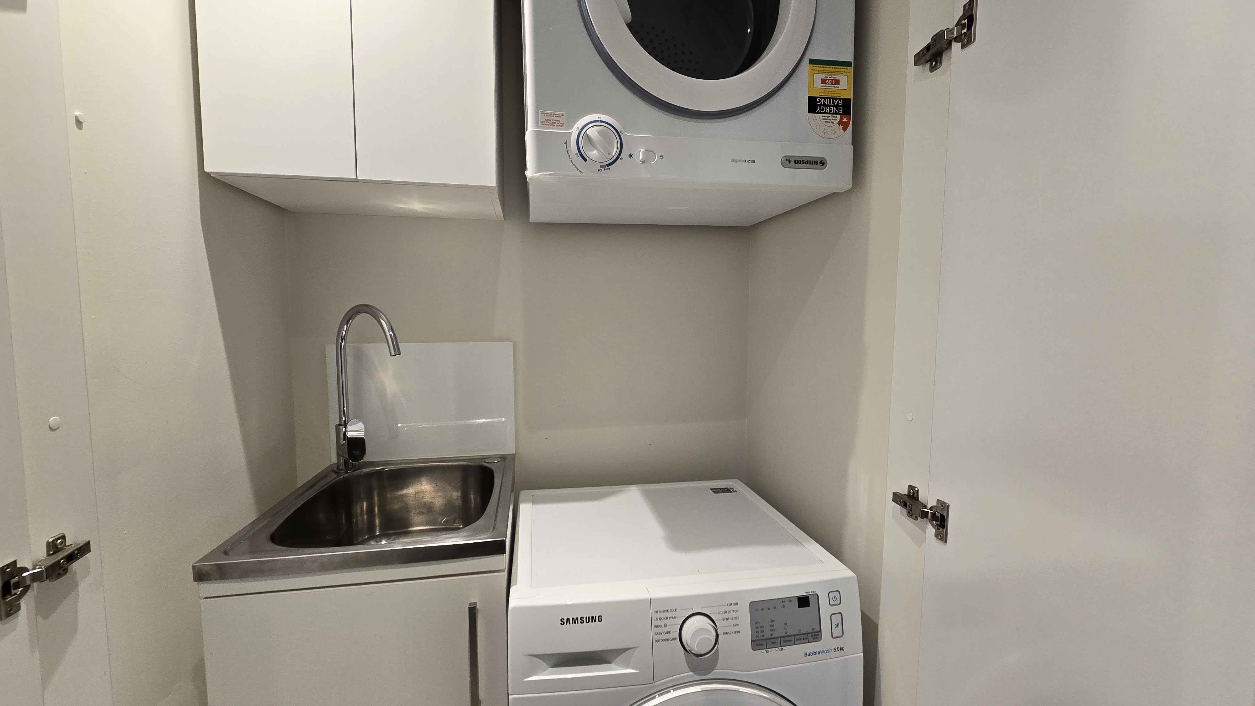 Laundry close to bathroom with overhead cupboard, trough, washing