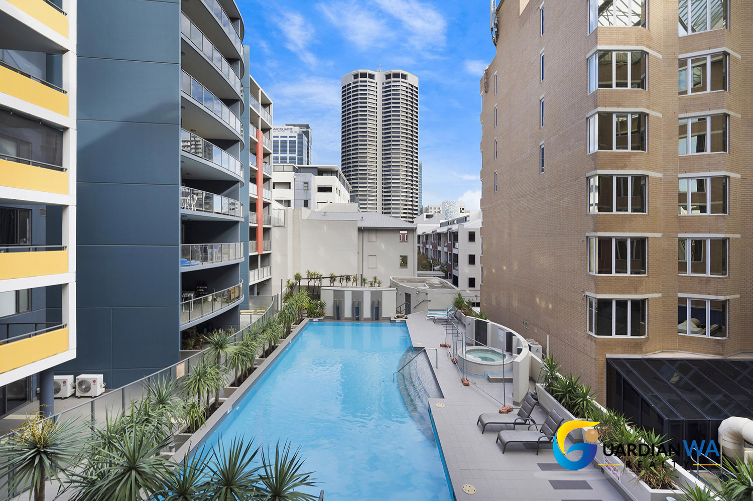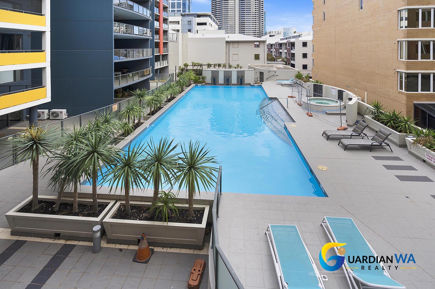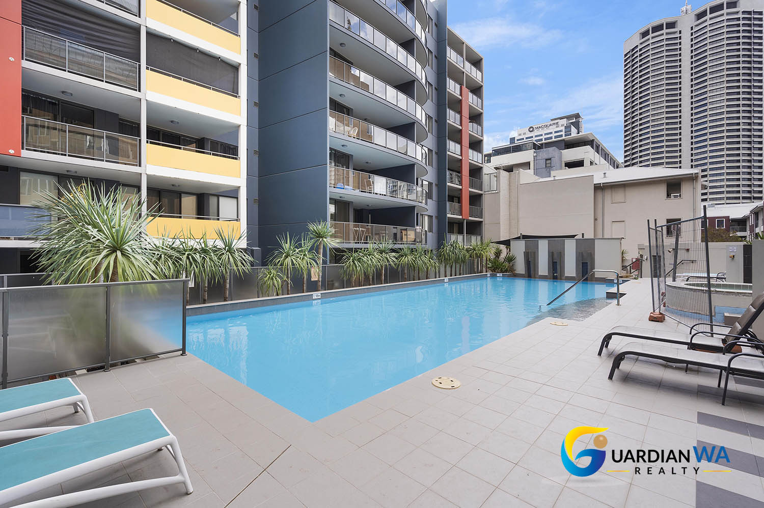Conveniently located 34/69 Milligan Street. This urban sanctuary offers the epitome of city living, surrounded by premier attractions mere moments from your doorstep. With Perth Arena right at the doorsteps and the city within minutes, walk to river, shopping malls, cafes, restaurants, train station, the list goes on. Facing the swimming pool with huge balcony, this apartment offers tranquility amidst the urban buzz. Featuring panoramic views of the pool, blue sky from the huge balcony. With the expansive balcony, an abundance of natural light, two spacious double bedrooms with ample wardrobes, ensuite and a second generous sized bathroom with integrated laundry facilities, reverse cycle air conditioning and a contemporary open plan kitchen featuring sleek stone benchtops with adequate bench space.
