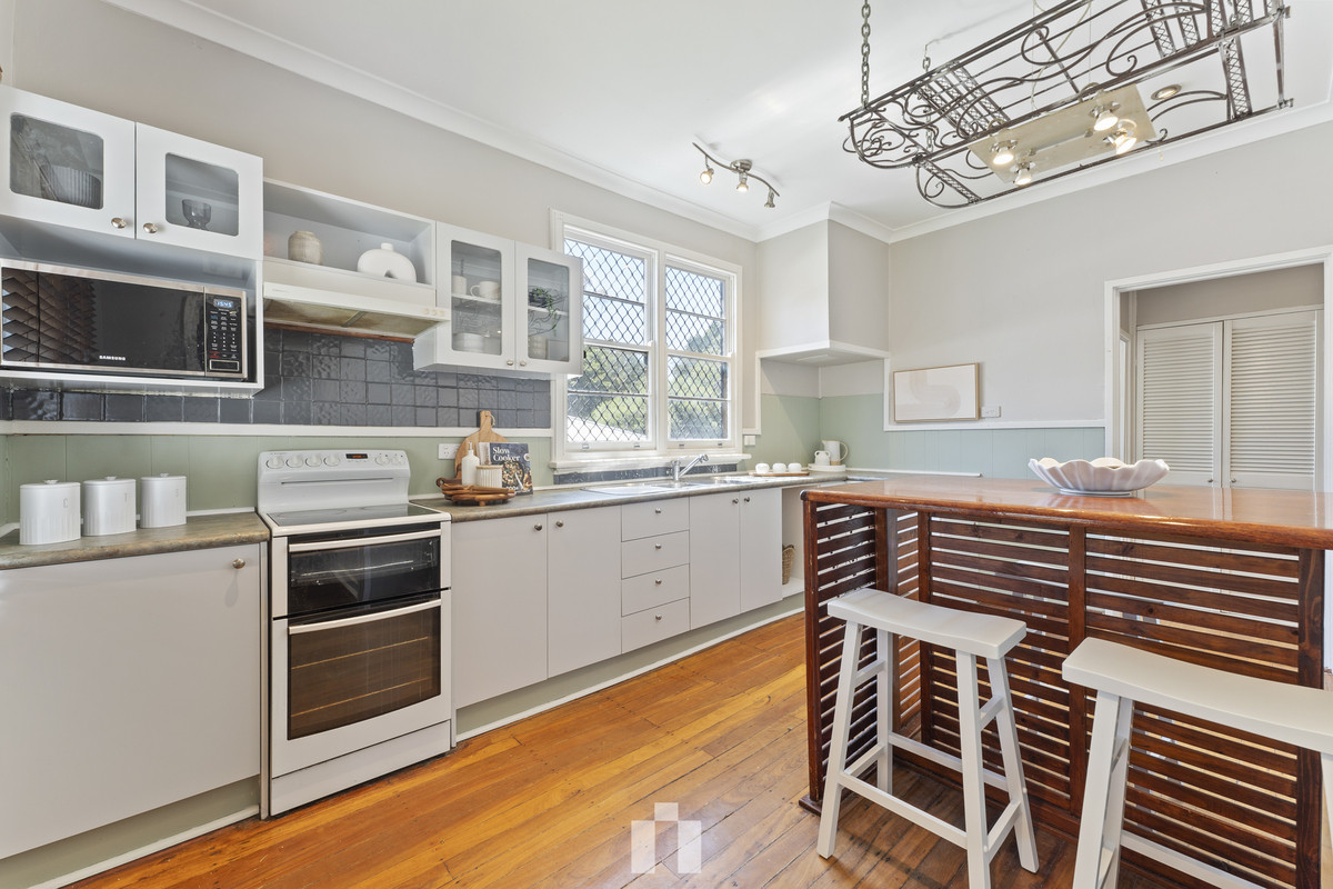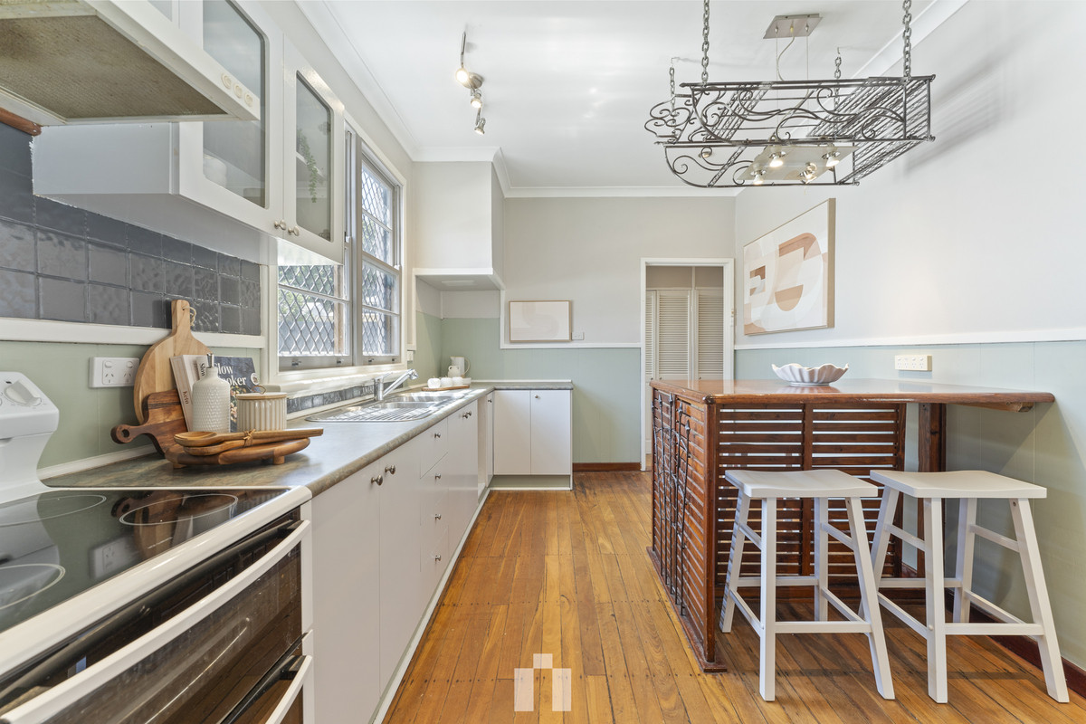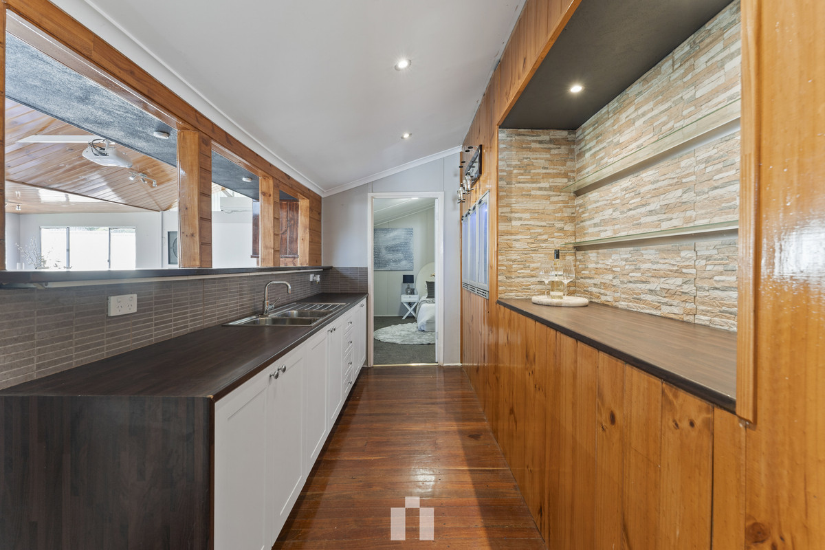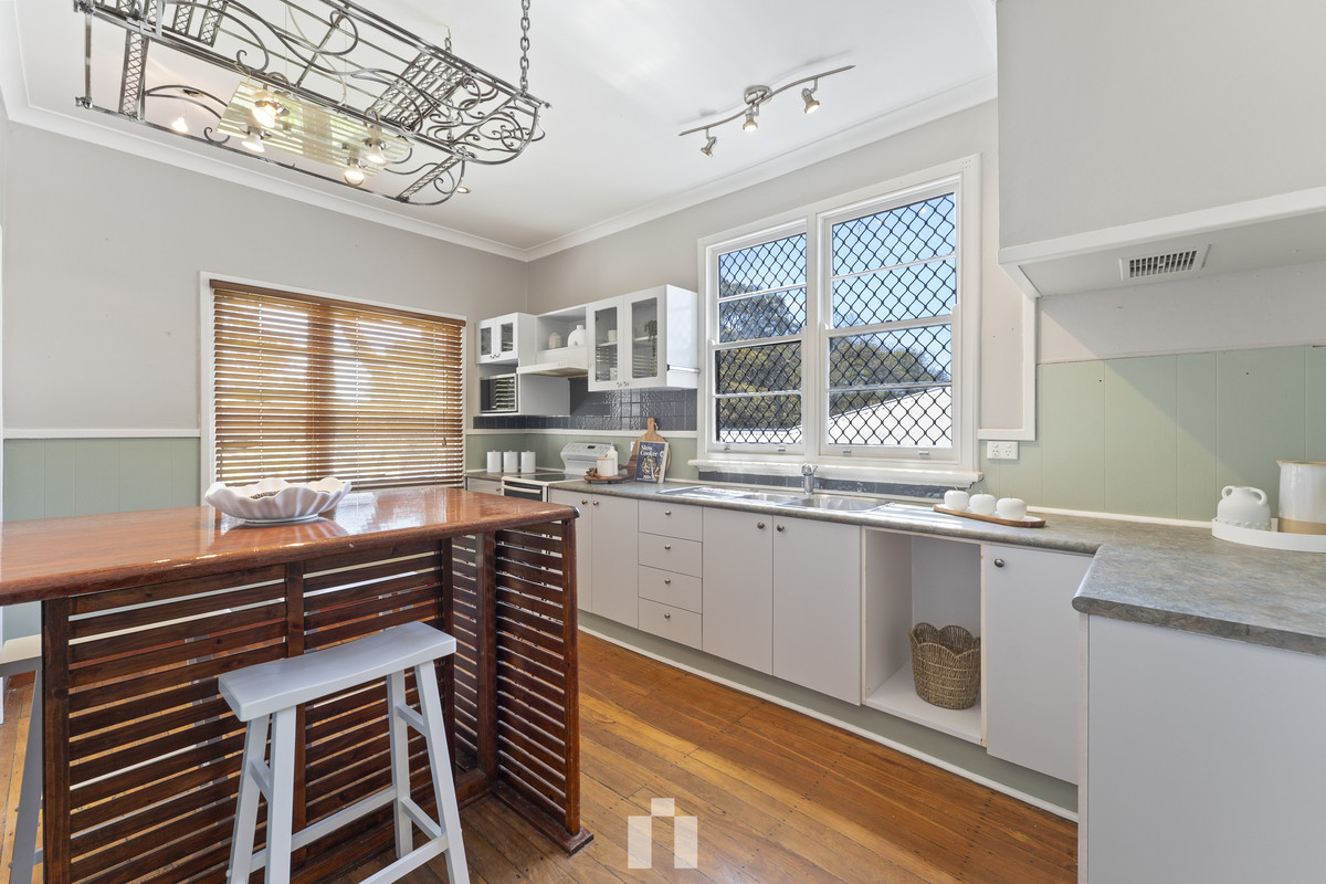 - Front yard adorned with lush garden beds and a tropical feel. - Relax on the veranda with timber decking, overlooking gorgeous gardens. - The lounge room exudes warmth with polished timber floors, timber venetians, downlights, and security screens with a Split System Air-con - The main bedroom is an ideal retreat, complete with two double built-in robes, a ceiling fan, and a ceiling-mounted TV—perfect for cozy movie nights. - The main bathroom has been refurbished - A gorgeous kitchen that's a chef's dream. - The bar area includes three bar fridges