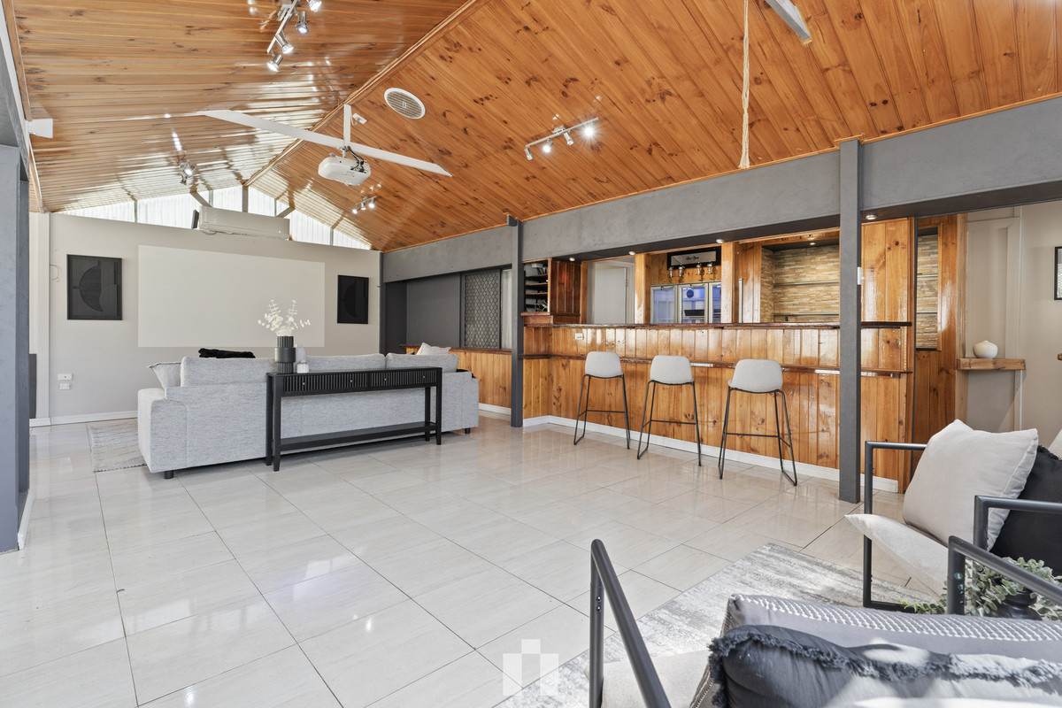 - Spacious games room and family room under a stunning gabled pine roof with exquisite tiled floors. - Equipped with split system air conditioning. - Projector available (negotiable). - Step outside to a patio area with a fantastic built-in BBQ. - Two garden sheds for extra storage. - A massive 9 x 6 workshop with 15amp power, workbenches, and an automatic closing door.