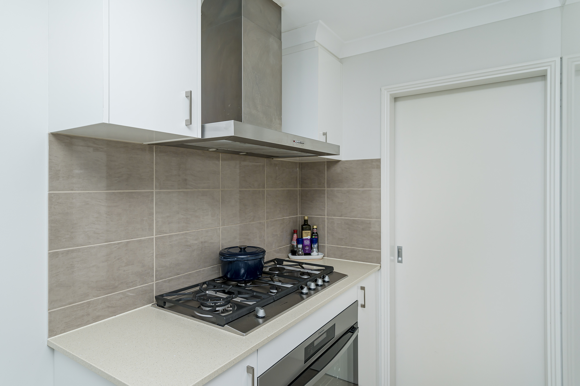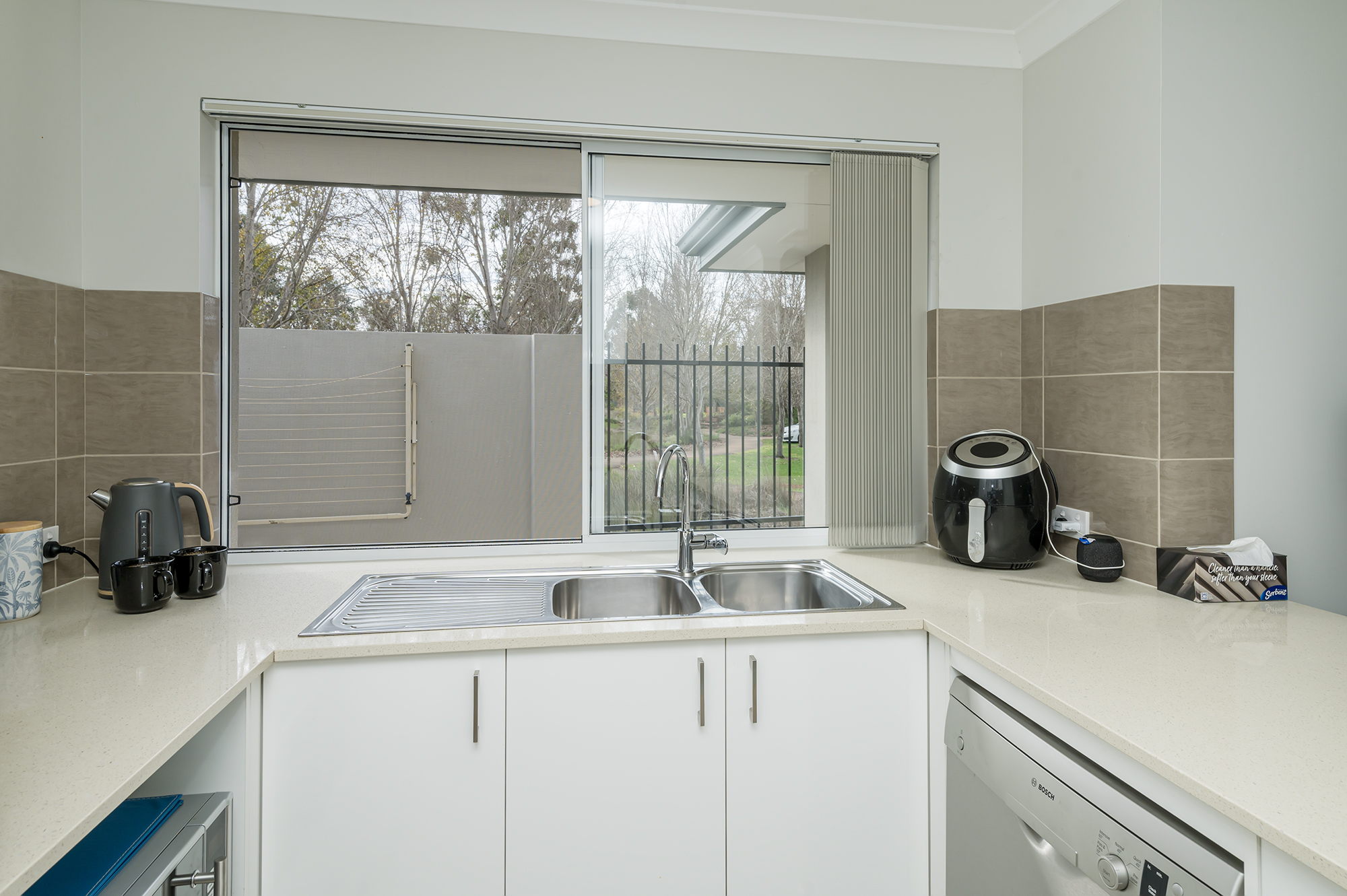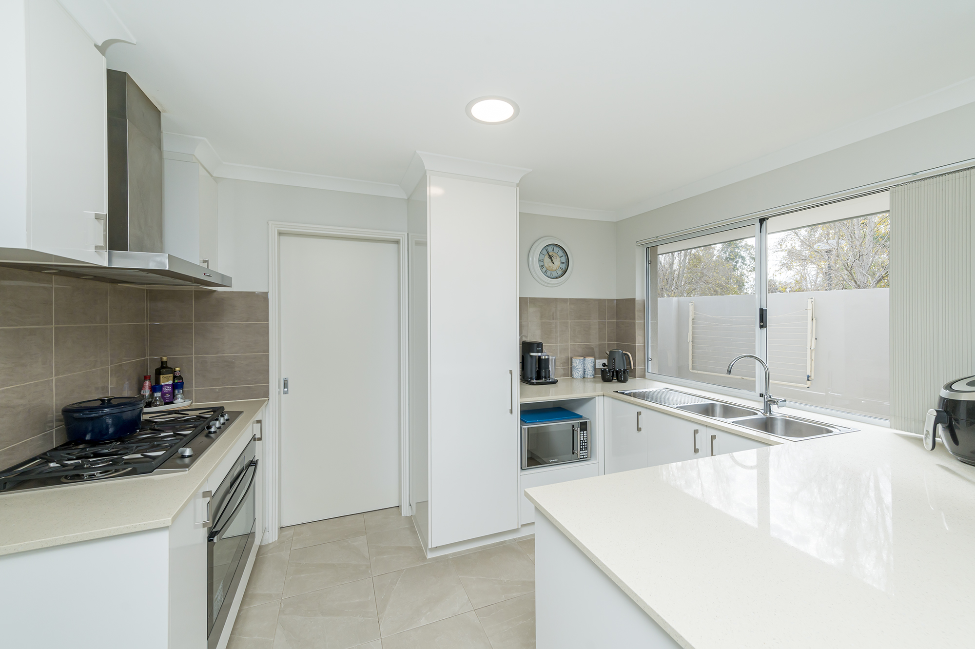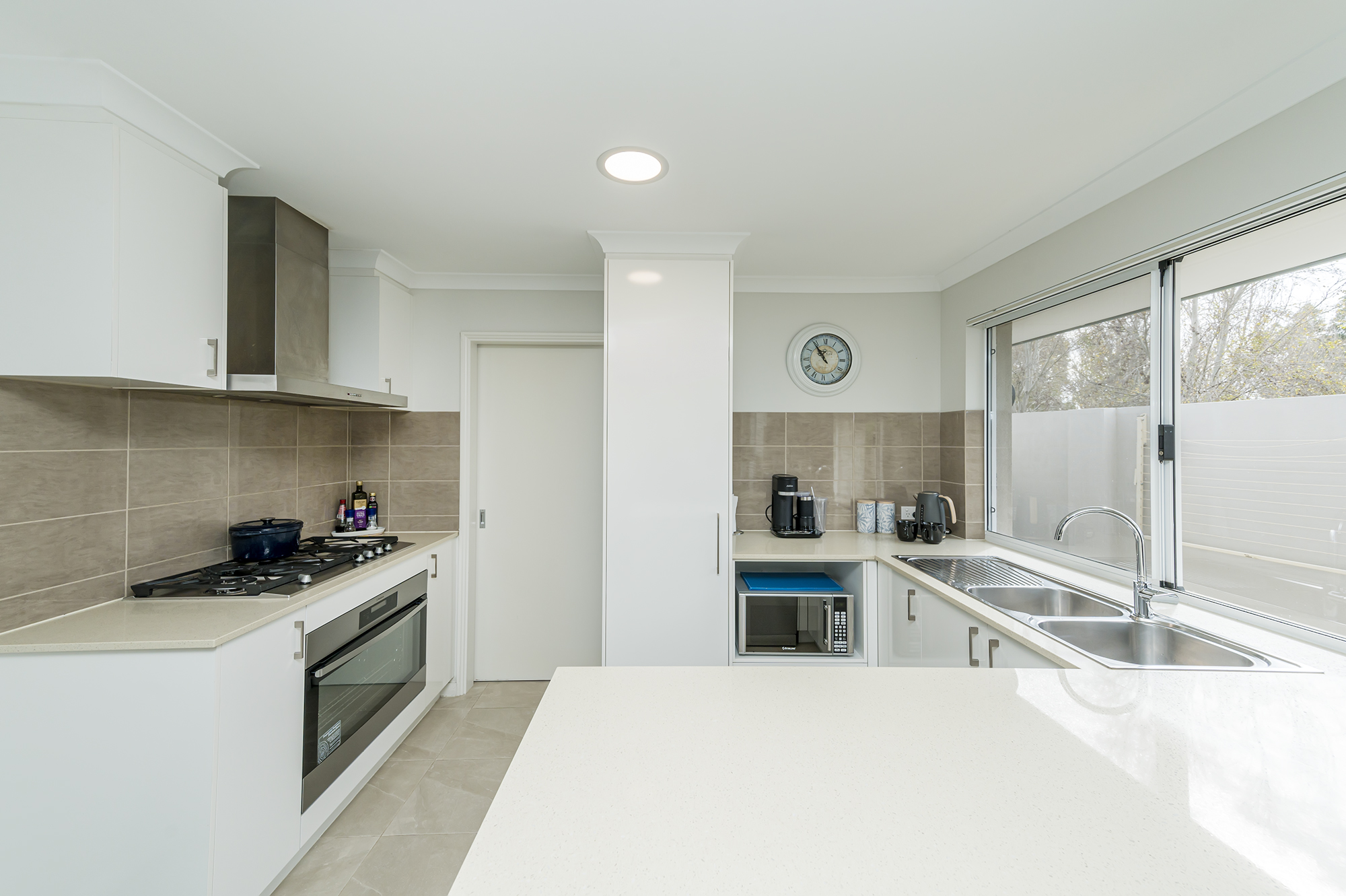 Contemporary kitchen overlooking park rees, features quality stainless steel appliances, pantry, ample cupboards and bench space