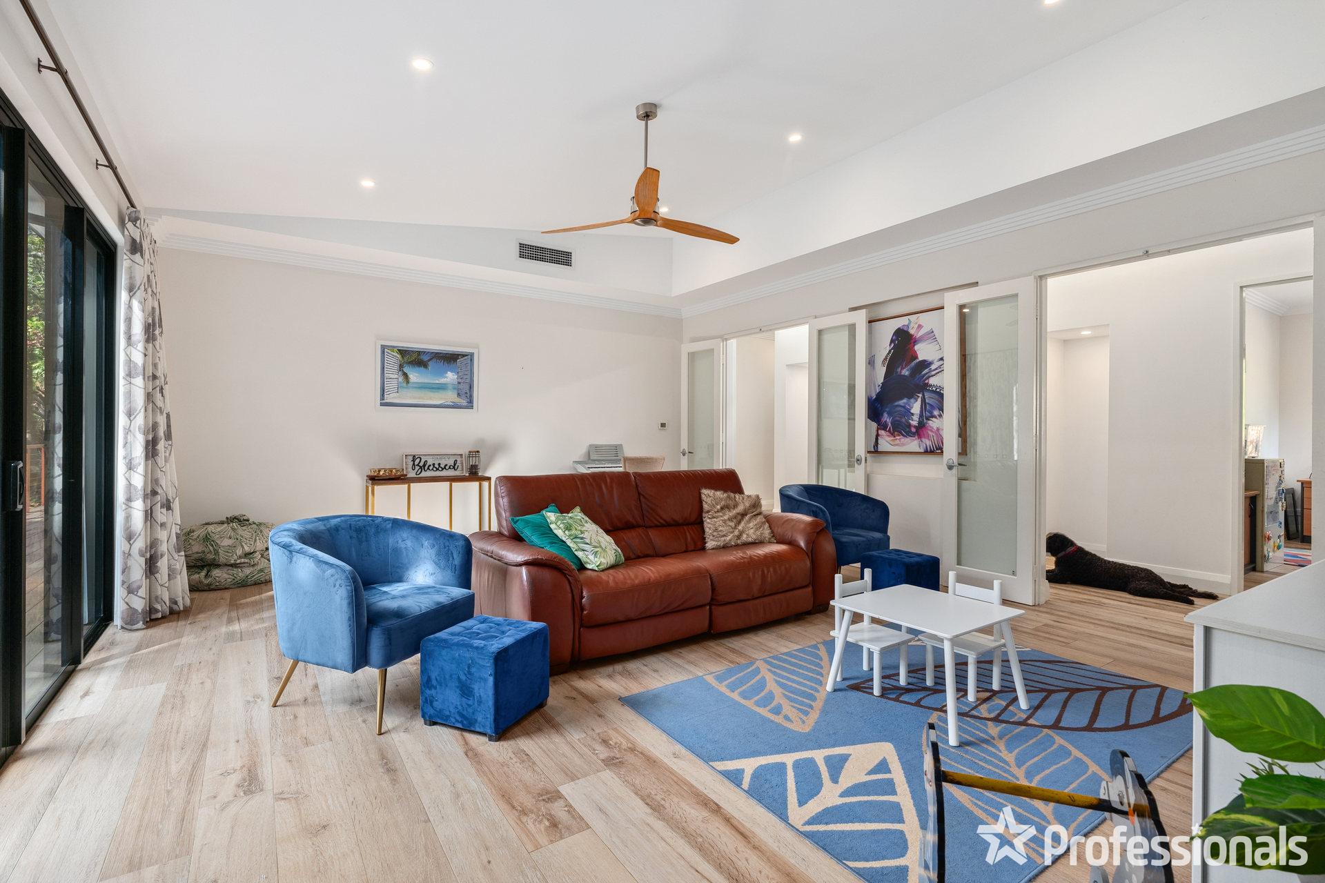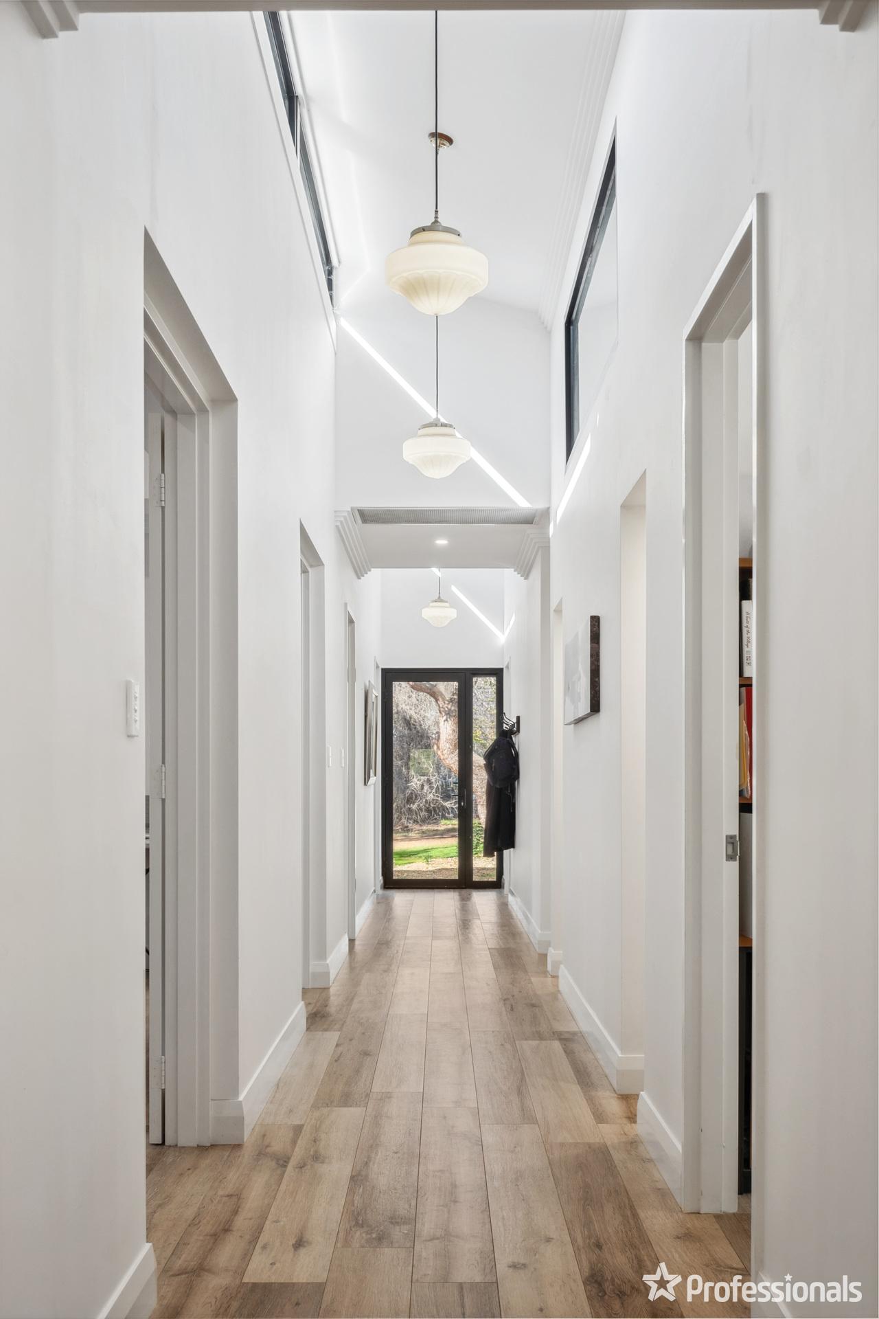 The imposing 2-storey residence is large enough for the entire family and comprises of 4 bedrooms + study, 3 bathrooms, multiple living areas, spacious modern kitchen and a central corridor with cathedral ceilings. The renovated kitchen with AEG appliances is the hub of the home and enjoys views to a large, grassed area where the kids can play.