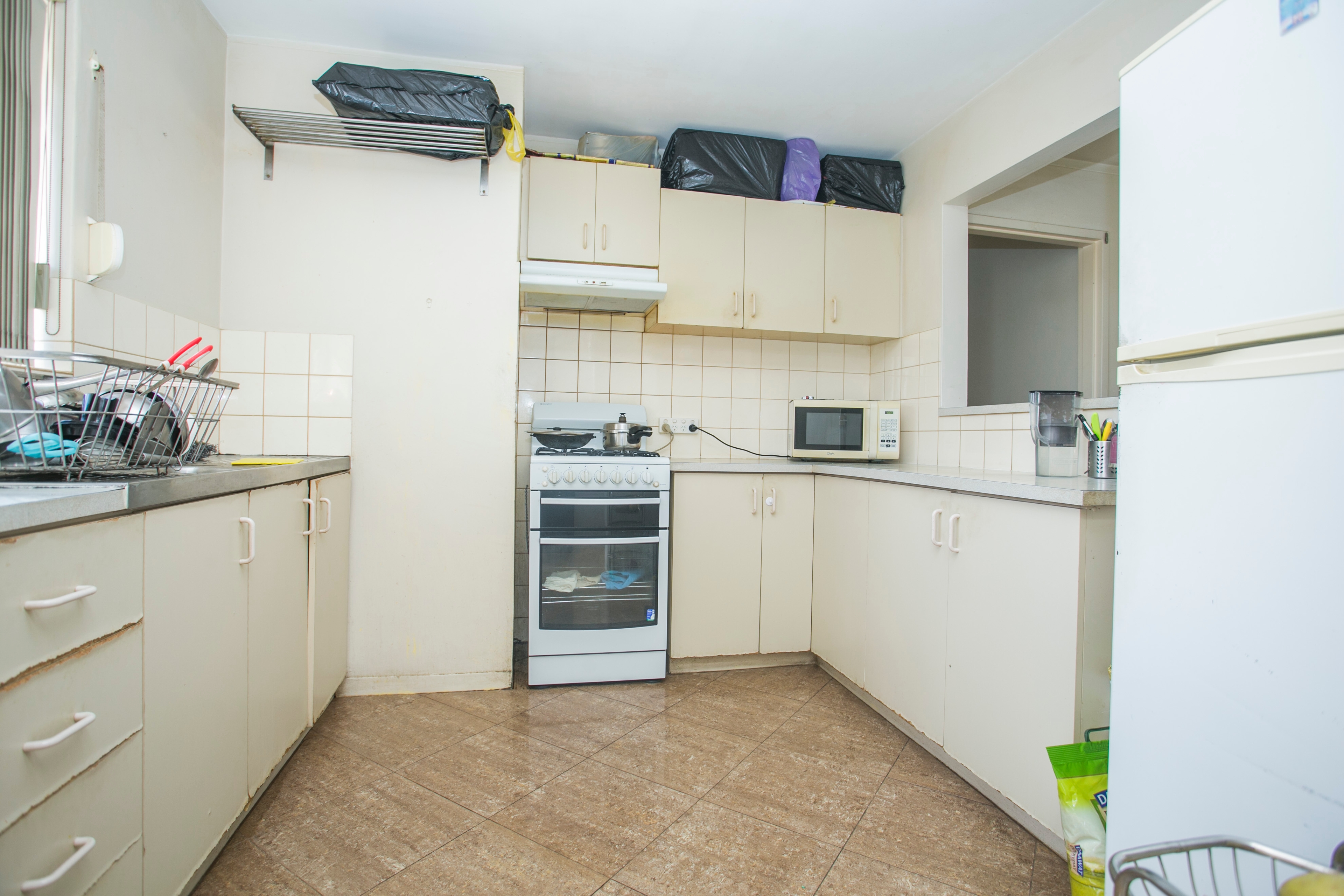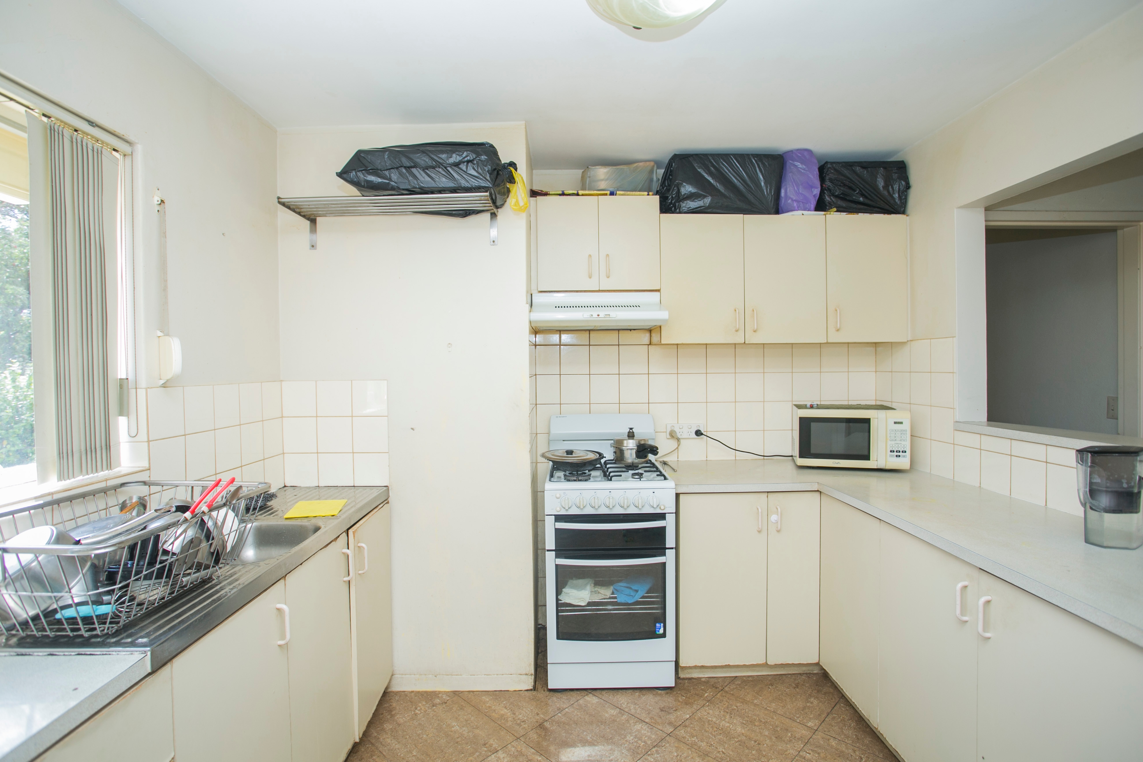 The kitchen layout means that there is a good amount of cupboards and benches for storage and cooking. Featured in this kitchen are a gas cook-top, a sink with a window looking out to the front of the unit, fridge space, and shelving for extra storage.